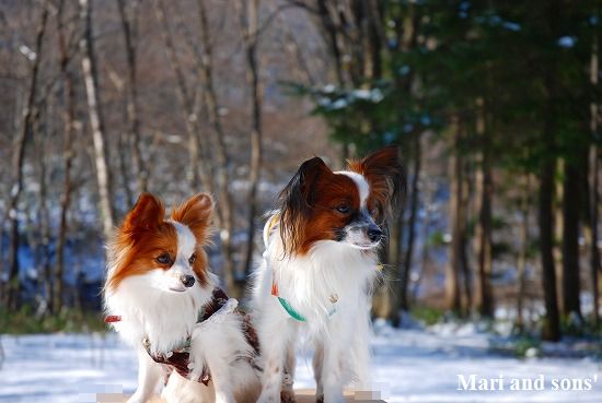 まりと康太の雪を払い除けますが これが足の飾り毛やシッポの毛に凍り付いていてなかなか払い落とせないので困りました |
