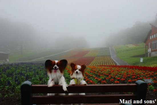 お花畑を眺めるベンチを借りて 先ずは金盞花と霧を背景にパチリ |