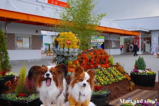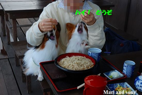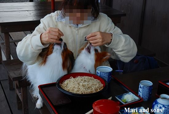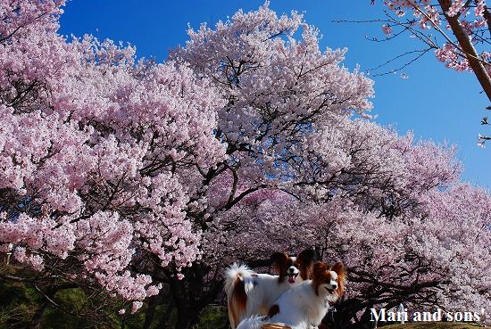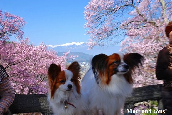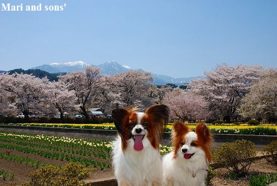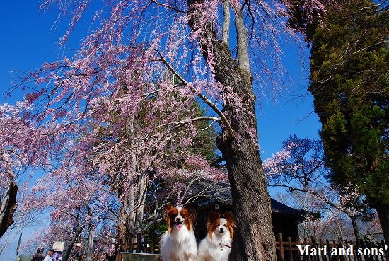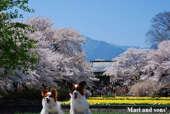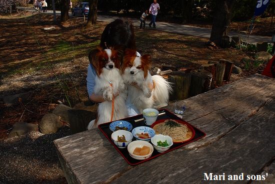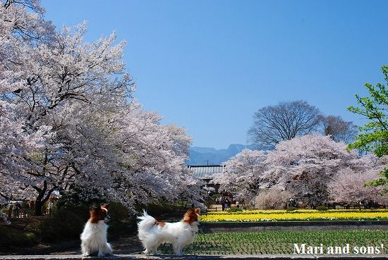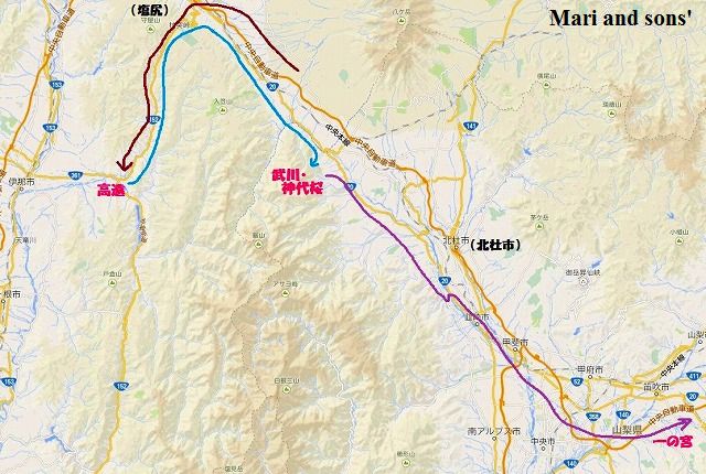 桜満開の城址公園を出た後は公園前にあるお店の庭でお父さんお母さんの腹ごしらえです 何せ朝 バナナしか食べてませんから まりと康太もたっぷりオヤツ貰ったし さて次に移動しましょうか もと来た道を諏訪方面に戻り武川へ向かうことにしました |