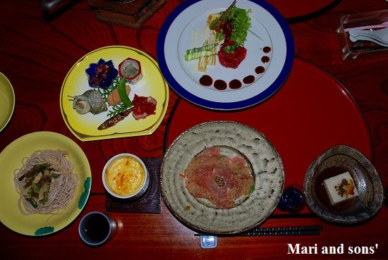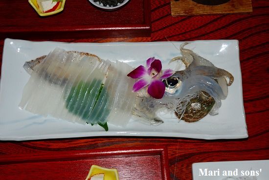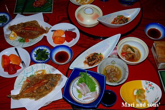 その遊歩道につながる旅館との出入り口に大きな水槽が三つ並んでいます その夕食がこれ このように! お父さんもお酒が美味しそうです |