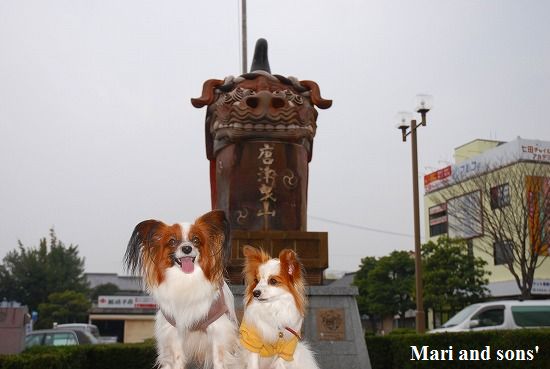 この後雨の中でしたが市内観光をしてみることにしました 観光案内図を頼りに先ずは駅前の唐獅子を 光量が足りなくて上手く獅子と二人を上手く捉えられませんでした |
