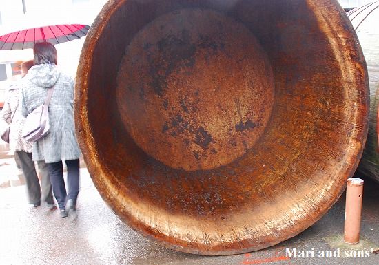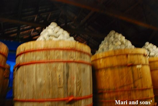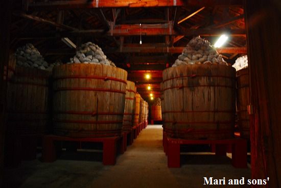写真はピンボケですが 蔵内の味噌樽と置石 そして次の味噌詰めを待つ空き樽です その大きさは横の女性がすっぽり入るほどの大きさであることがお分かりいただけるでしょう
