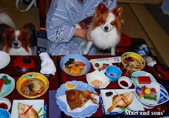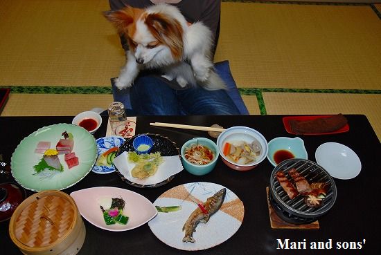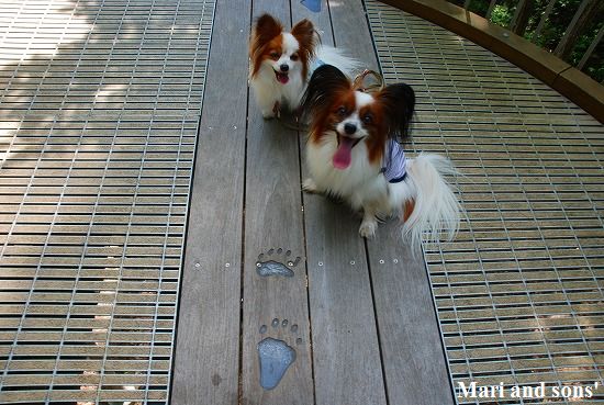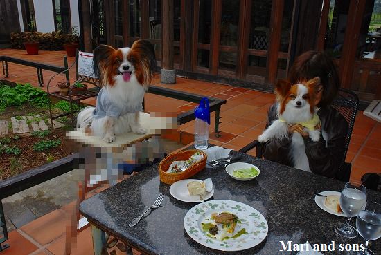 さてもう一方の期待である食事ですが レストランの中庭に面したテラスではこの子達の同伴がOKでした 早速お願いして ランチメニューから選びます |
