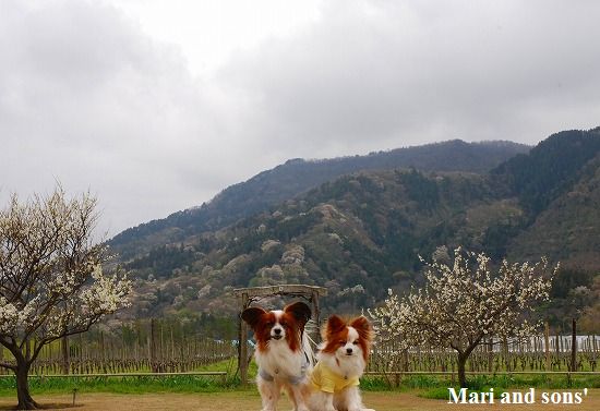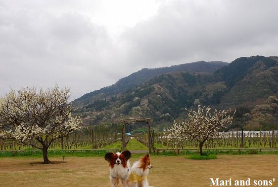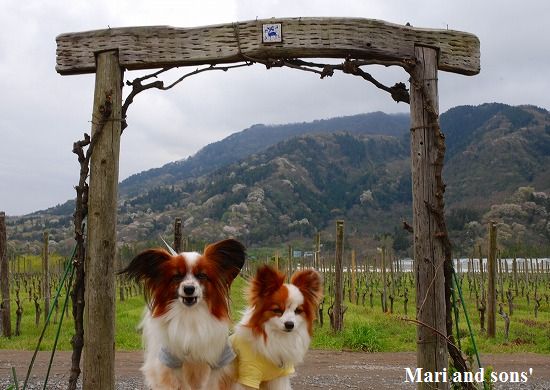 ブドウ畑の先に見えるお山には桜が彩りを添えていました |