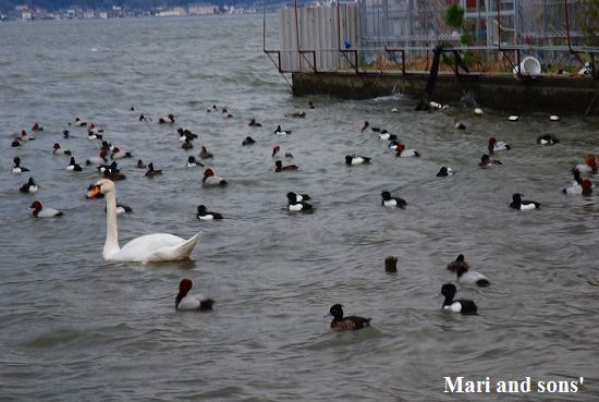 池畔にあるので 旅館のすぐ脇に餌付けされているのか冬鳥が多く集まっていました 白鳥も居るのです |
