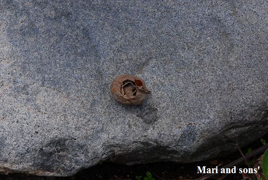 お分かりになりますでしょうか!? 胡桃の実ですが 上手に齧られて 中身を食べられています |