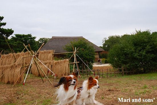 この丘の向かい側に 昔の農家の佇まいが再現されていました 水路が無いけど稲作は行っているようで稲が干してありましたので 柿の木と藁葺きの農家を背景に記念の一枚です |