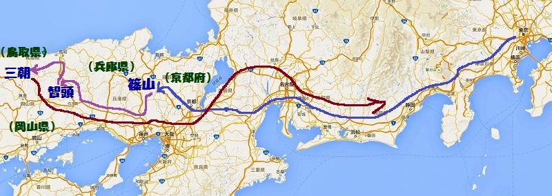 全体図で説明しますと まず東名・第二名神そして京都縦貫道を経て兵庫県篠山市に一泊します |