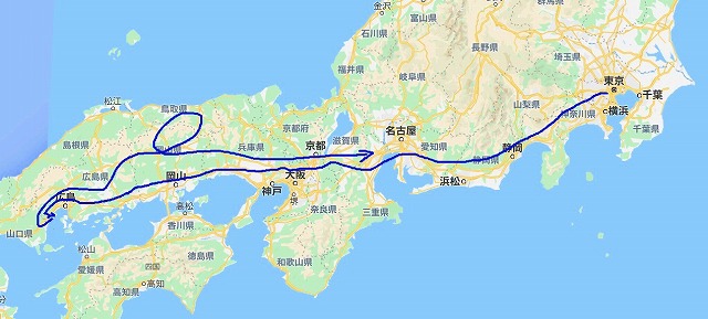 全体の行程図ですが 往復2000キロ 片道10時間のドライブとなります |