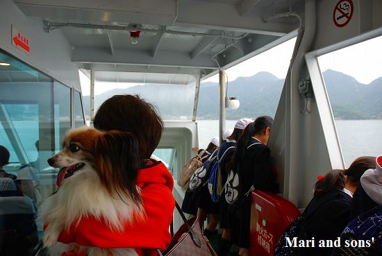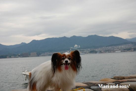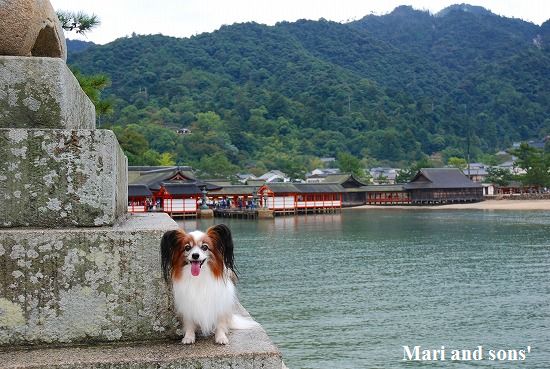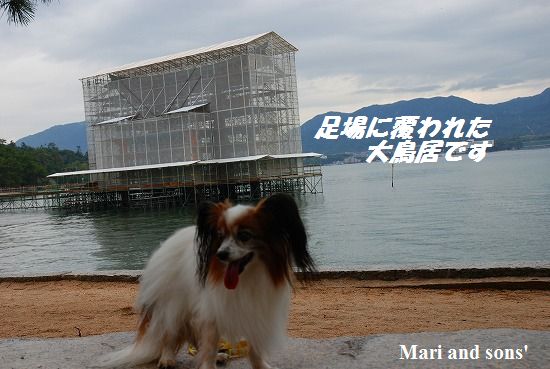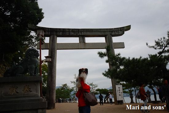 ヤレヤレ やっと宮島につきました 子供たちの波は続きますが何とかその隙間を縫って二度目のお宮参りです 小雨の中浜辺の護岸に乗ってもらって上陸記念の一枚です |
