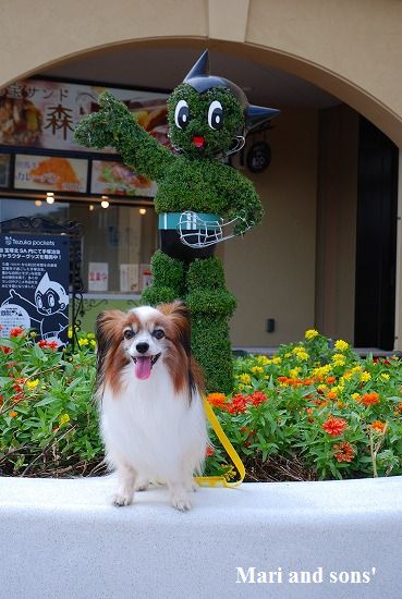 宝塚は漫画家手塚治さんの故郷と言うことでしょうか 構内にも外側にもヒーロー・ヒロインが飾られています 外に鉄腕アトムが設置されていましたから一緒に一枚です |