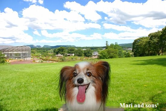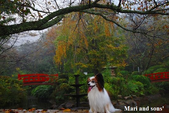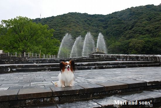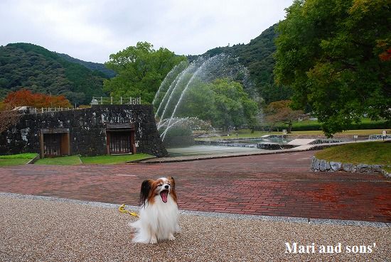 康太にお座りで 一枚とっていたら お姉ちゃんたちが ワ〜ッお利口! と褒めてくれました 今回は時間もあるので前回訪ねられなかった山頂のお城を目指すことにしました 目指すと云ってもロープウェイを使うのですが ケージに入れれば康太も同行できるとのことで錦帯橋を渡ってその先へ進みます そこに広がっていたのは立派に整備された公園でした 石垣を利用した噴水が活き良いよく噴出していましたので記念撮影です |