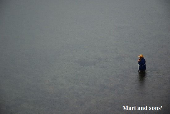 潮が本殿まで上がってきています 康太のお立ち台は傘をささなければならず手塞ぎなので車に置いて来ましたので 石段とかこのように灯篭の段などで代用させてもらっているのです |