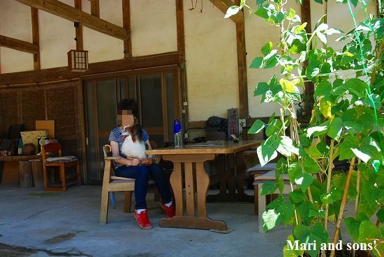 案内どおり何席か戸外にテーブルが設えてあり 私たちが案内されたのは 古い以前の店舗だったのでしょうか の深い庇の下の風の気持のいい席でした |