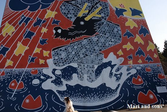 これは 駐車場側のロープを止めた壁面に描かれた絵ですが 康太はどこ!?ってなってしましました |