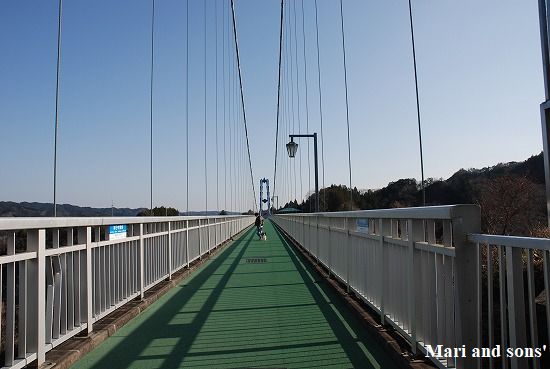 康太は 橋は橋でも鳴門大橋では怖がらなかったので 足元がしっかり作られていれば平気なようです 途中に何か所かあった隙間の空いた格子の上も平気でしたから 感心しました おとうさんなどは ちょっと下を見ただけでお尻がもぞもぞするといっていたのに バンジージャンプの入り口なのでしょうが そこから下さえ覗くのにはおかあさんも驚きました |