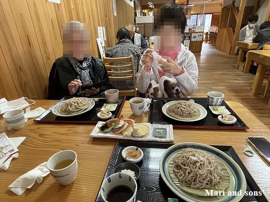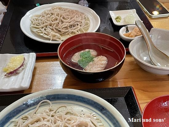 その 蕎麦正まつい さんでお昼をいただきます おばあちゃんとおかあさんはざるそばを おとうさんは 辛味大根とあったので箕輪の辛味と比べたくて おろしそばを頼みます 天ぷらも名物らしいので頼みましたが カリッ!サクッと いい塩梅です おとうさんはこれも比べたくて そばがきを頼みました 私たちが入った時にはほんの数人のお客でしたが 気が付けばなんと入り口付近までの順番待ちになっていました 人気店に早く入れてよかったと思いました |
