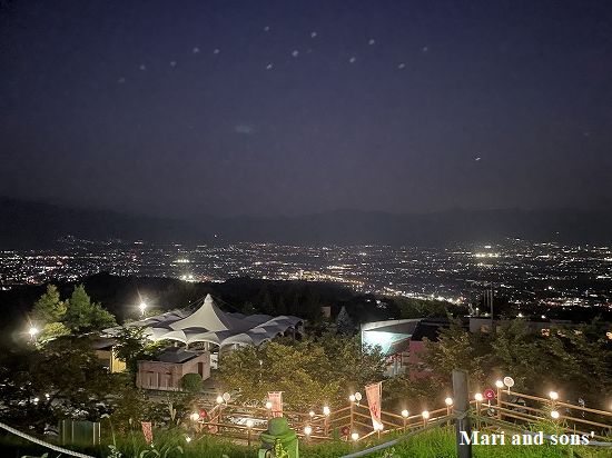 のんびり湯に浸かって 上がってきたらこの夜景でした 時間によると左手の山裾を電車が走り 銀河鉄道みたいですよ とは先の支配人のお話でした |