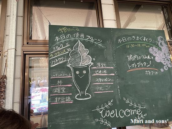横の黒板に 使われている材料が示されていました 8種類の果物がつかわれているのでした グラスの底にもゴロッとラフランスが入っていて ごちそうさまでした |