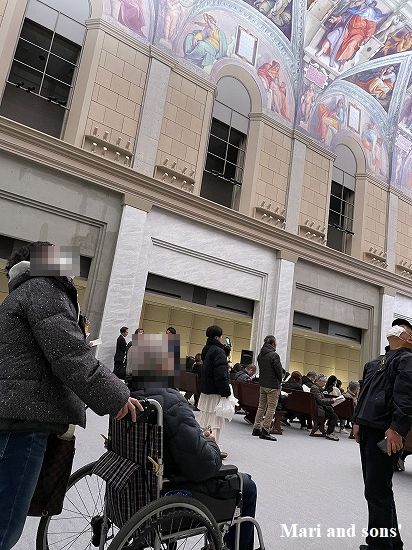 そして開場 入り口から なんとまぁ長いナガイ登りエスカレーターでB3階へたどり着きました ここは広いし移動に大変だからと 今回だけはおばあちゃんに車椅子を利用してもらうことにしました |