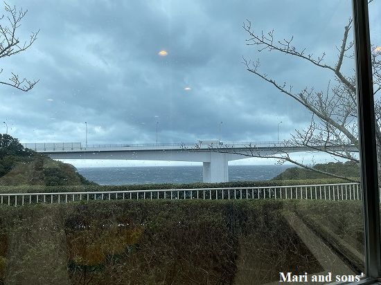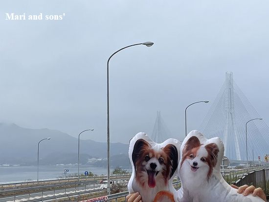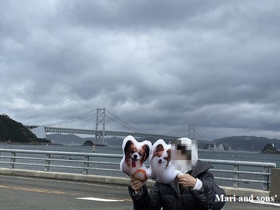 結局3時間ほどを費やしても全てを見つくすことができないのでタイムアップ! とお昼を兼ねて 大鳴門橋の下にある 渦の道 へ行ってみたのですが ここでも海岸を走る道路でザンブリコと波飛沫を大いに浴びてしまいました まりも康太も 強風でいや増す寒さに負けています さて時間は大丈夫でしょうが 雨の中では風景は望めませんので余裕をもって次の目的地金刀比羅宮へ向かうことにします |
