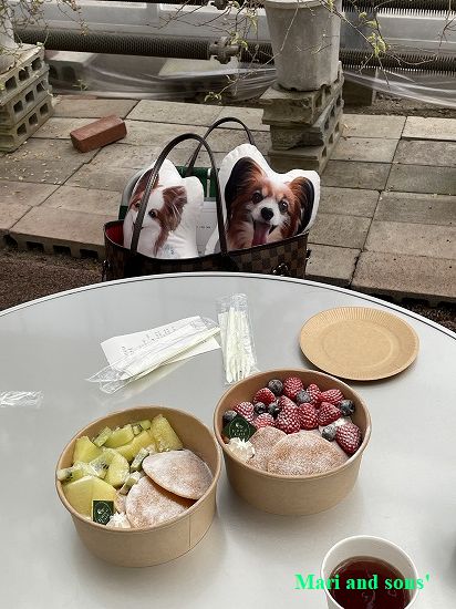 そんな園内で パンケーキに果物添えでお昼とします |