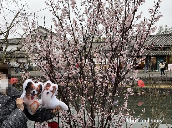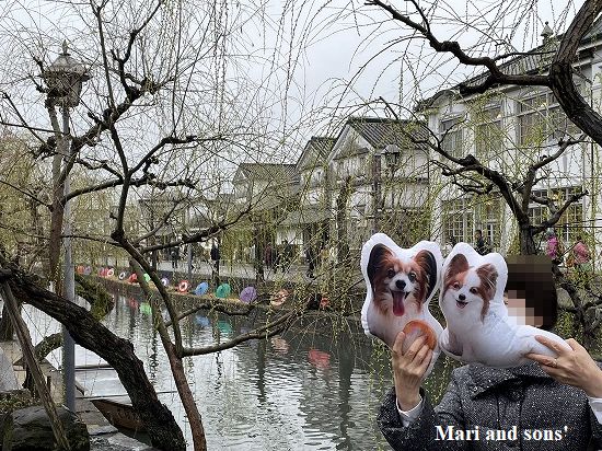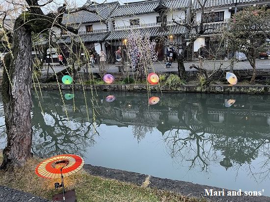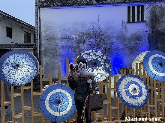 ここでいったんホテルに戻り体を温めて 夕食の前に川縁に和傘を使ったライトアップがあるというのでもう一度美観地区へ |