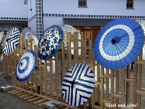 倉敷民芸館だったでしょうか 敷地内にこれも和傘を飾りライトアップしています |