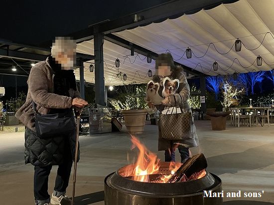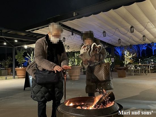 レストランの前の広場でマシュマロ焼き用の焚火を出していましたので あたっていいかと聞くと どうぞということであたらせてもらいましたが 薪が爆ぜてビックリ! |