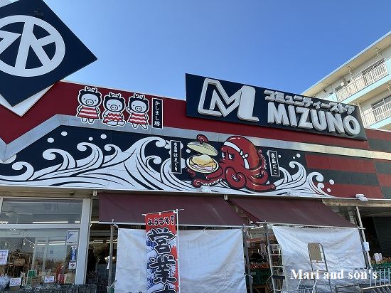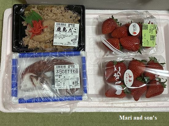 さて野菜や果物それにソフトクリームも購入して まだお昼前です このまま鹿島港近くのスーパーマーケットに向かえばちょうどお昼時を狙った “タコ飯”が並んでいると踏んで車を走らせます タコをあしらった看板です 私たちはあのTV東京の番組で紹介されなければ ここ鹿島がタコの水揚げ国内No1だなんて知りもしませんでしたし ここにタコ飯があることも知らなかったのです 縁は異なもの (ホント)味なもの ということでしょう |