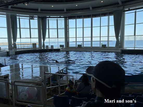 サメの水槽や標本類の多さに驚いていたところに館内放送でイルカショーの案内が流れます 会場に足を運ぶともう六割方が埋まっていました ところどころに “水しぶき注意”の案内が張られているのでチョット高めの場所に座りました 最前列のそれこそ 砂被りならぬ 水しぶき被り にいる親子などは雨具にビニールシートをしっかりと準備しています 分かっているのですネェ |