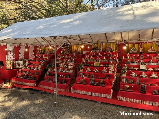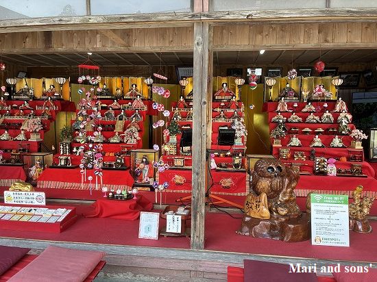 社務所脇には 雛飾りが右も左もきれいに飾り付けられていました |