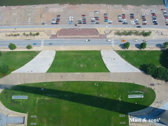 下へ目を向けてみます 広がる芝生へ アーチの影が映っています 駐車場はミシシッピー川の河川敷で 春先はよく洪水に見舞われます |