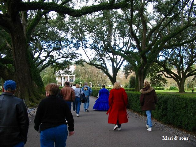 さて 次のツアーです このツアーは 南部の農園主のお宅訪問です (アトランタではないものの)スカーレットの実家訪問というところです ガイドさんも 南部の衣装に包まれて登場です 青いロングドレスを着ているのがその人です |