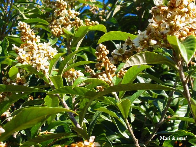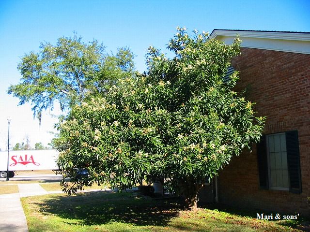 アラバマでの駐車場にビワの木が花をつけていました 日本では春の頃に当たるのでしょう このとき12月27日でした |