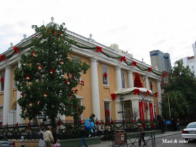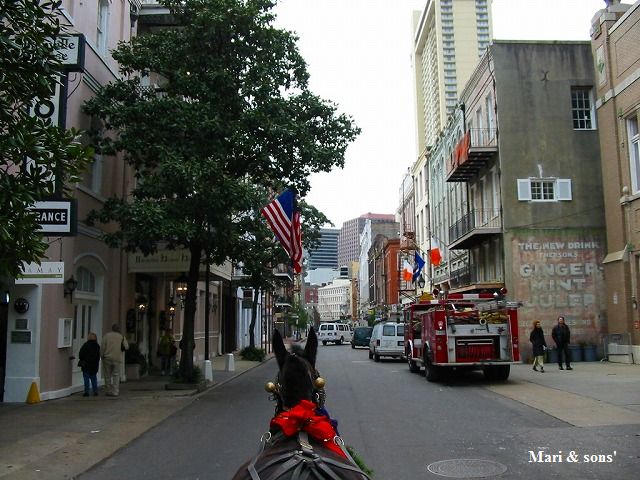 馬車に乗って観光です 所々 建物や塀に赤いリボンがつけられていますが これはクリスマスの飾りです |