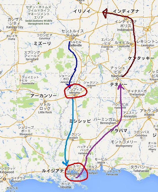 最後の年のクリスマス休暇に どこかへとなり 暖かな南部 さすがに季節柄ホテルの確保が難しいのでニューオリンズだけは事前に予約を入れておきました その他は 相変わらず行き当たりばったりということになります 大まかな位置関係は次の通りです |