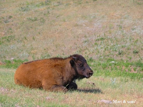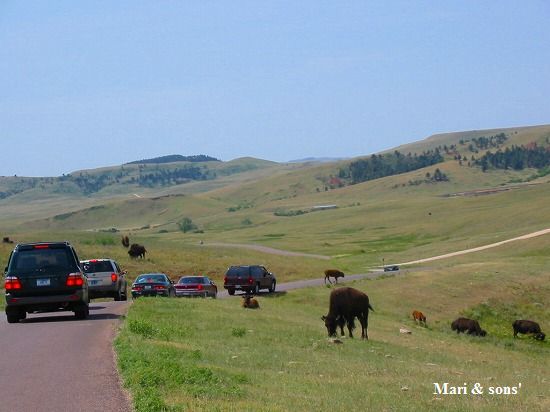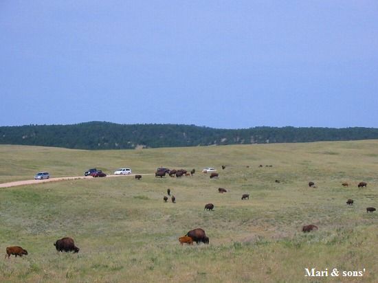 暫く進むと渋滞しているようです 何かあったのかと思ったら みんな珍しいし危険なので徐行や一時停止をしていたのです セントルイスの近郊でも牧場で飼われていましたが ここは野生のバッファローです |