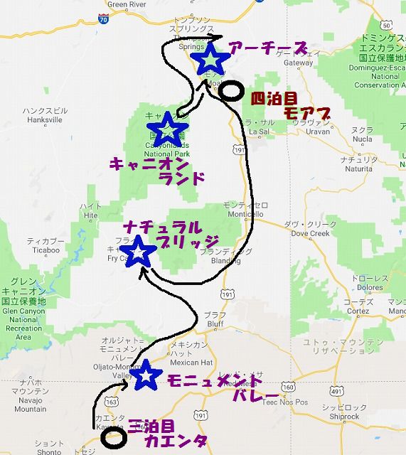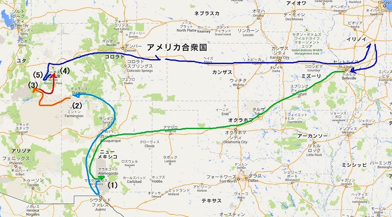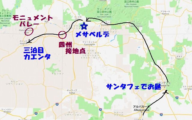 一箇所だけではせっかくの遠出が無駄になりますから 州で言うと ニューメキシコ・コロラドそしてユタの三州にまたがるドライブです 相変わらずの 予約なしぶっつけ本番の四泊5日の遠出です 位置関係は下図のようになります |