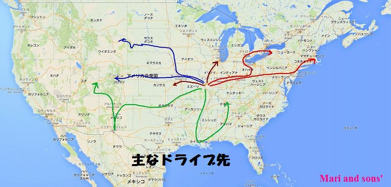 この車はさすがに大きいし内装が革張りでしたから座りごごちも良く ドライブの楽しさを味あわせてもらったものです 最終的に走行距離89000マイルになりましたので キロに直すと14万キロを越えたのですから 年にして5万キロ弱のアメリカの大地を走ったと言うことになります 参考までに主なドライブ先を示してみます |