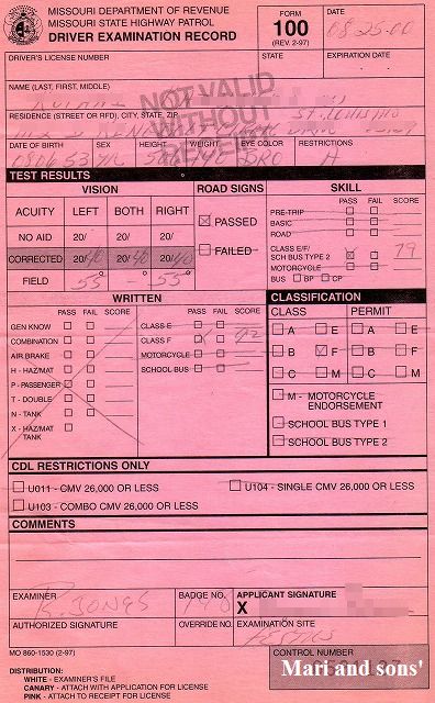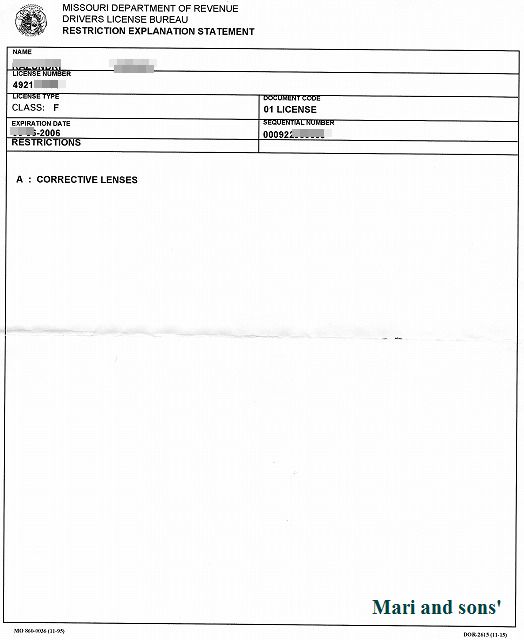 上のコピーがミズリー州の ”歳入庁運転免許部” とでも訳すのでしょうか その部署の名で発行されたレシートです 実に 真に簡単でスピーディーな手続きでした これで晴れて アメリカの免許を持ったわけですが もし また別の州に引越しした場合は改めてその州の免許を取る必要があるそうです |